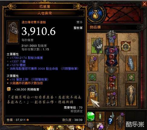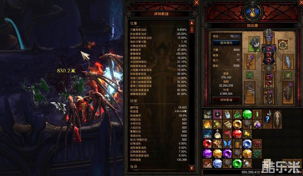 下面再就是万众期待的散件火炮了,由于我ptr号只是做测试的,2.4重新开荒的角色,巅峰、宝石都不能看,只是客观的来反映一些数据,目前全身远古就差对戒的一个,12件远古装备,今天更新后几大刀对荆棘伤害的面板砍得不要不要的: