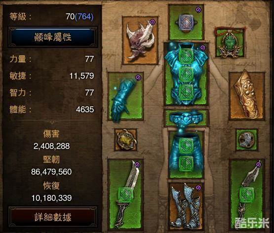 武器的选择开始是用殷娜杖,腾出一个戒指位置的,然并卵,蛋疼的攻速伤害再高也无济于事,虽然有100%的小弟增伤,白字4300+,血量也多,但是站不住;对拳?别闹,怎么拉怪?最后想到了对剑--30%的攻速,护甲,伤害,是不是独立增伤就不管了,双持攻速上去了,击回有效果了,站撸精英再也不蛋疼了,我真懒。