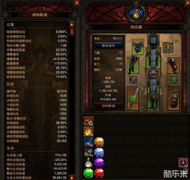 这是我的面板,装备不是很好,巅峰只有600多,宝石只有50多级,全身只强化了两件50级宝石,所以伤害很低,但这不是关键,注意看坚韧和击回。