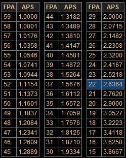 FPA是帧数,APS是攻速。22帧是2.4双巫医吹箭流所能达到的最高档位(即双巫毒加成下),那么经计算,本体站街攻速要堆到2.04能实现22帧这档,换算到装备位,2.4版本是手套、两个戒指、腰带、武器能追求攻速,那么在武器是7攻速的情况下,可允许其他部分少2%的攻速,假如武器是6攻速,那么其他部件必须全部7攻速。5攻速的武器就洗掉吧。以上讨论的是组队吹箭的档位,单刷档位看其他帖子有分析。
