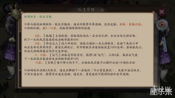 妖狐秘闻副本狐生百。通关第6、7、8、9、10层更有大量金币、神秘的符咒、御行达摩和妖狐新皮肤·夜魅之狐可以获取。快来感受妖狐的魅力吧!