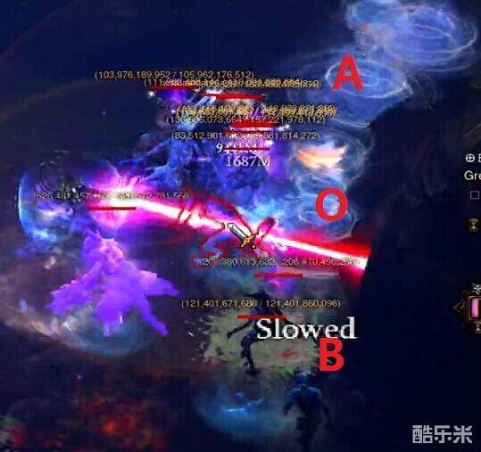 上图是我在视频里随手截的一张图,我们需要做的就是对着O点放风,旋风在到达O点后,会产生3种可能:A、B、O点静止,而在往A、B方向行进的过程中,又有可能出现转回人物方向或返回O点方向,因此旋风的命中数会得到显著的提高
