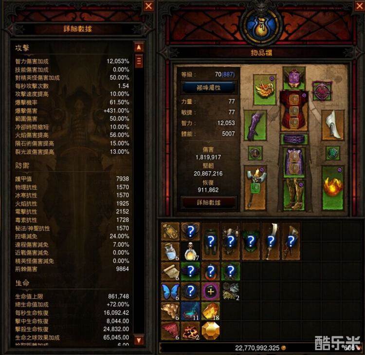 火衣提供增伤和减耗,精英护腕作用自然不用说。萃取选择焚炉精英怪打的更快一点,左键腰带能增加单体伤害和流畅性,华戒5+3必备。宝石流血可以换成精英宝石,其他都是最优的选择。