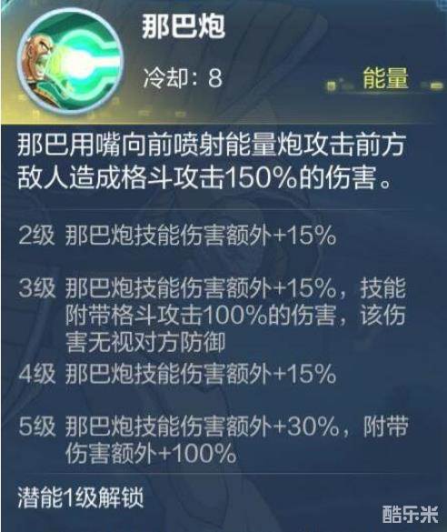 猴叽发现那些身大力不亏的家伙们总喜欢从嘴巴里吐点什么出来。那巴也是如此,那巴炮作为直线攻击技能可以直线上的敌人造成杀伤,升级到5级还能加130%的额外伤害。并有无视对方防御的效果,可谓威力不小。