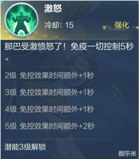 生气后的那巴虽然会降低他的判断力(本来也没有╮(╯▽╰)╭),但是会让其变得更为狂暴。激怒状态下的那巴在该技能5级状态下可以在10秒内无视对方一切控制技能。龟龟,果然被愤怒冲昏头脑的那巴不是好惹的。