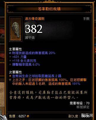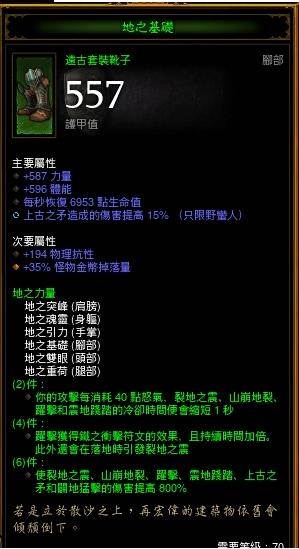特效为:震地践踏触发山崩地裂,另主要词缀中多了一条山崩地裂的技能伤害200%