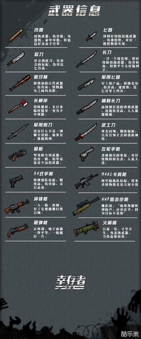 幸存者危城武器介绍,幸存者危城武器解析。幸存者危城作为一款末日生存游戏,武器是必不可少的,那么在游戏中都有哪些武器,哪些武器比较好用呢,下面一起来看看各武器介绍吧。