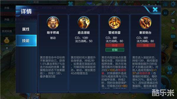 对没有位移技能的黄忠来讲,一技能算是一个小小的弥补,增加移动速度的同时还能增加攻击力,在逃跑或者追杀敌方英雄的时候都是一个帮助很大的技能。