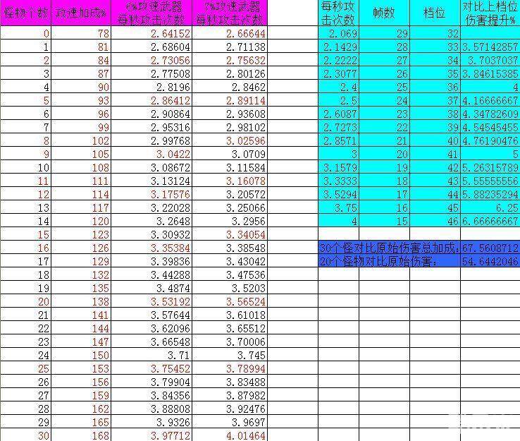 2.怪物超过20个之后会卡,30个以后基本卡到不能动,所以表格只写出了20个怪物的伤害加成。需要的朋友可以自己相加。
