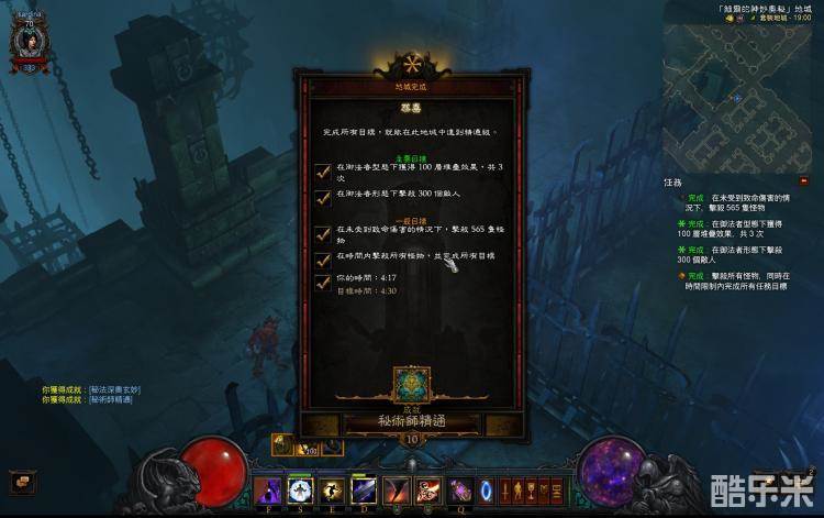 总体来说精通的难度在于限时内清完所有的怪,所以不要刻意做任务,一路往前扫不要漏怪,以太应该是必备。途中怪很多就引一下做点燃45怪任务,大怪清掉后周围有30只左右小怪就可以考虑做自杀陨石任务。