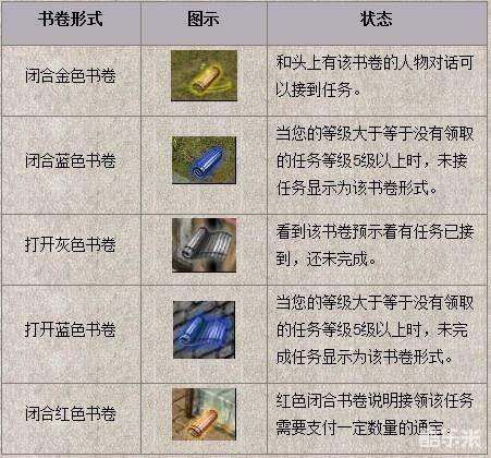 人物头顶的书卷表示这里有任务需要完成。认清不同的书卷,可以快速分辨出任务状态。
