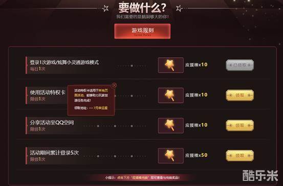 本次评选赛不仅能获得红黑套装,玩家可完成下列任务积攒应援棒来兑换精美的礼品哦。