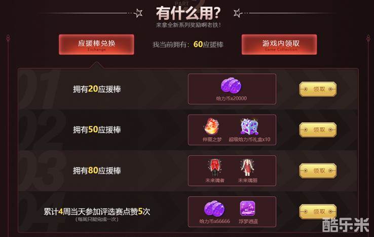 应援棒达到相应的数量,可以解锁以下四重好礼,精美的未来瑰者/未来瑰丽套装只需要80应援棒就能拥有,还有大量给力币撑爆你的背包~(兑换消耗应援棒哦)