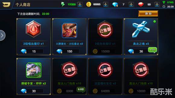 这是由金币和蓝钻买东西的商店哦,由于游戏蓝钻购买金币比较便宜,所以这个商店里面不推荐用蓝钻购买道具哦,当然3级以上魔印还有打折的稀有卡牌还是可以买的
