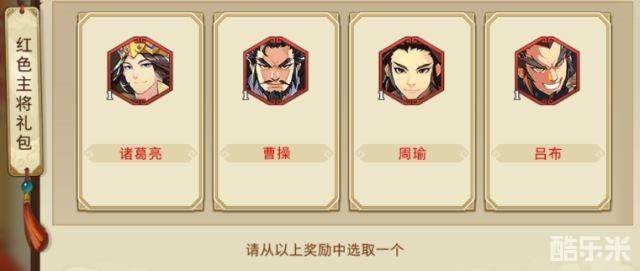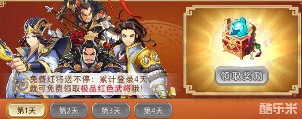 如果你是进入新服务器(呃,除非对老区执念特别大,没人会去开了很久的老服务器玩新号吧?)那么在你登录的第二天,可以去福利---极品红将中签到,每次签到可以得一些元宝,签满4天就能获得一个红色主将礼包,打开可以从四个红色主将中选择一个领走……顺带一提,本人领了诸葛亮。