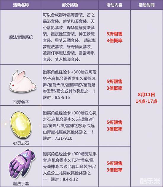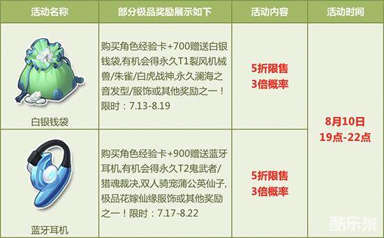 8月10日-12日连续3天每天固定时间段,多款人气宝箱限时5折出售、3倍极品爆率。人气宝箱【白银钱袋】/【蓝牙耳机】/【可爱兔子】/【心灵之石】等新品宝箱均参与活动,可产出永久S车【烈焰新星】/【黄蜂战神】/【雷神之怒】、永久T2【孙悟空】/【擎天战神】等惊喜奖励哦!