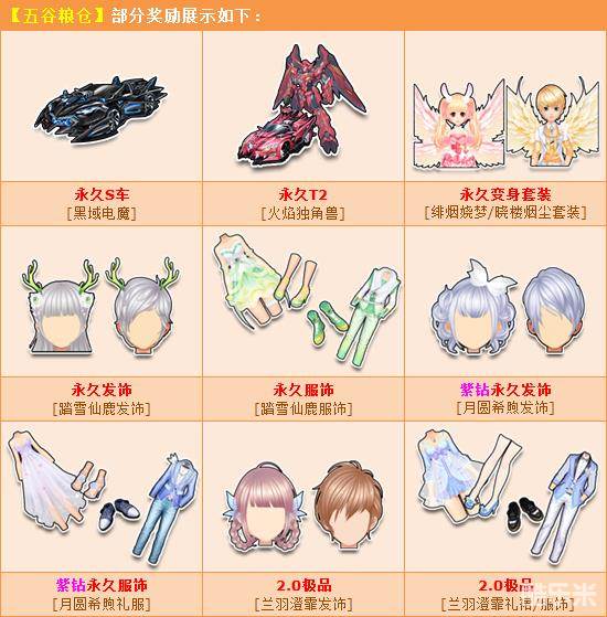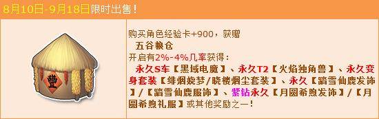 8月10日-9月18日购买角色经验卡+900,获赠:五谷粮仓,开启有几率获得:永久S车【黑域电魔】、永久T2【火焰独角兽】、永久变身套装【绯烟娆梦/晓楼烟尘套装】、永久【踏雪仙鹿发饰】/【踏雪仙鹿服饰】、紫钻永久【月圆希煦发饰】/【月圆希煦礼服】或其他奖励之一!获得核心奖励永久型概率是:2%-4%,获得核心奖励期限型概率是:4%-6%,获得非核心奖励概率是:90%-94%。