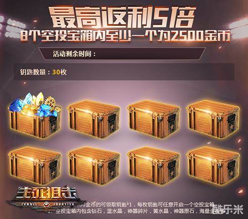本次活动共有八只空投宝箱,且每个宝箱均为唯一,无法重复开启。八个宝箱均有几率直接开启2500金币奖励,若是运气不佳,前面的宝箱都没有开启到终极大奖,那么最后一发宝箱则是100%几率开启2500金币奖励哦!也就是说,只要参与本次活动,就能百分之百获得五倍返利。另外,宝箱奖励是有保底限制的哦!就算你是“纯种非酋”,在本次活动中,单个宝箱最少都能获得500金币。保底返利一倍,脸黑的小伙伴也大可放心来参与!