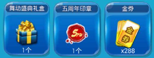 奖励为【舞动盛典礼盒】【五周年印章】【大量金券】