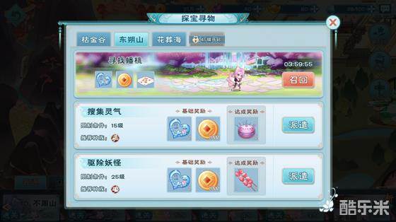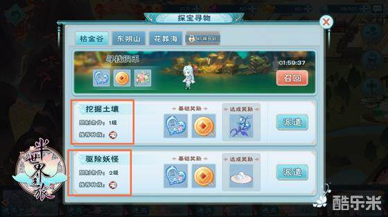 在“寻宝”玩法中,我们可以派遣自己拥有的伙伴前去各个寻宝地点完成任务,从而获得金币以及提升各个半世界男神好感度的礼物。随着你的人物等级的提升,会开放不同的寻宝地点,而这些寻宝地点的任务对于伙伴的种族和等级都有不同的条件限制。所以各位小仙女可以在一队游刃有余的情况下,培养其他的伙伴来轻松完成寻宝任务。