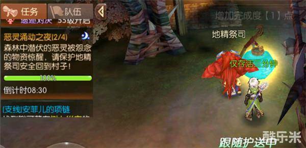 日阳森林的怨灵闻到物资蕴含的怨念气息,前来阻碍祭司护送物资。在这一阶段,玩家将护送地精祭司安全返回村子。在护送过程中,需要击败怨灵,当击杀数达到一定程度,或阶段倒计时结束,本阶段结束,发放阶段结算奖励,事件进入下一阶段。