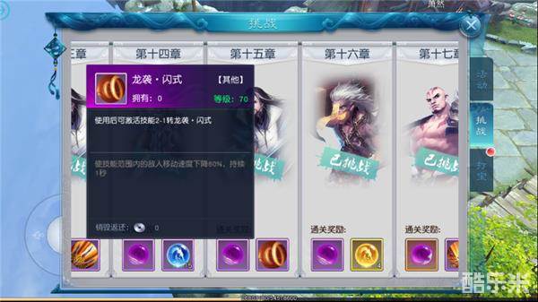 挑战玩法,在活动界面,挑战页签下可以进入。分为多个章节,每个章节又分为5个BOSS挑战,玩家需要在一定时间内打过,并通关章节就能获得章节奖励。挑战奖励也是我们日常获取稀有道具,技能书以及60级之后需要的心法技能书的重要途径。