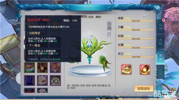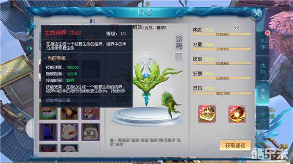 定位是近战辅助,虽说是树妖但长得却像海草,自我介绍那里也是非常魔性的海草歌……树妖的五项属性成长很平均,主动技能可以在身边生成一个回复生命的结界(跟灵仙类似),被动能使附近友方单位攻击力提升20%,同时主人获得攻击、生命和闪避的属性加成。