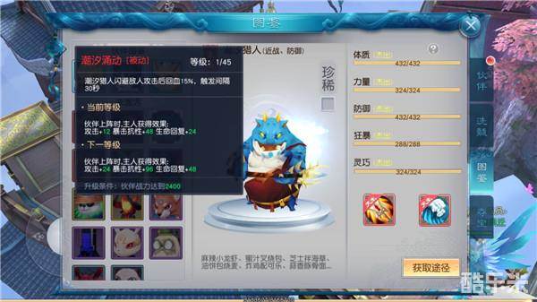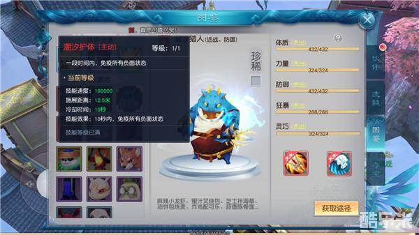 定位是近战防御,看了下介绍发现是个吃货,估计是很能吃的缘故,体质跟防御的资质比较突出……主动技能可以一段时间内免疫所有负面状态;被动技能在回避敌人攻击后可回血15%,同时主人获得攻击、暴击抗性和生命回复的属性加成。