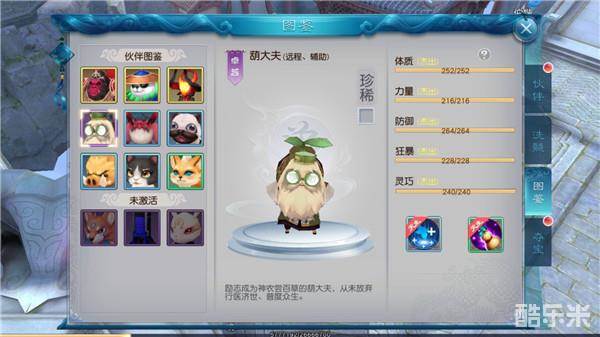 励志成为神农尝百草的葫大夫,从未放弃行医济世、普度众生,因此在游戏里它的定位是远程辅助,以治疗为主。主动技能续命可以给自己和友方加血,被动技能吸取可让它在攻击时,20%的几率恢复自身5%的生命,而且上阵时还能给主人增加攻击、暴击抗性和生命回复的buff,可以说是个续航能力极度强力的伙伴。