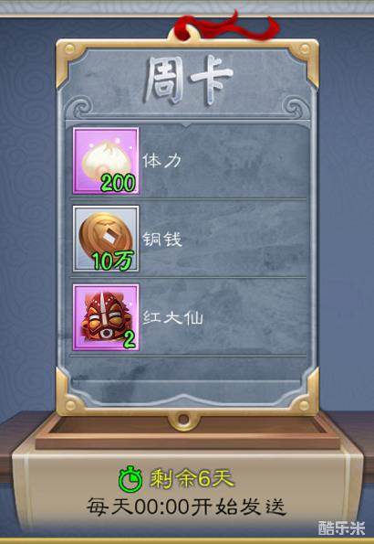 购买周卡需要30金条。每天可以获得200体力、10万铜钱以及两个两星红大仙,持续7天。总共加起来一共有1400点体力、70万铜钱与14个二星红大仙。
