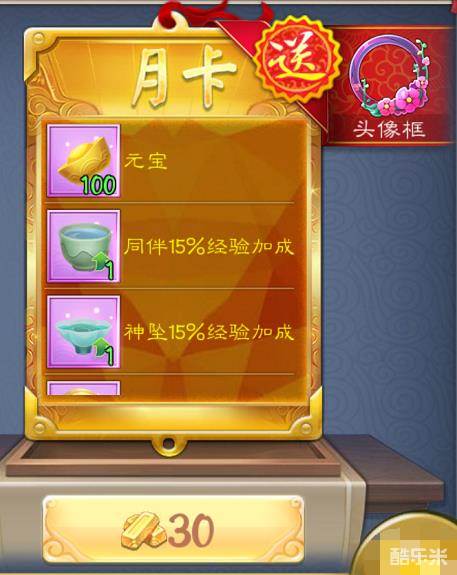 购买月卡也需要30金条。购买成功后,每天可以获得100元宝以及每天都存在的15%同伴经验、神坠经验以及铜钱加成,持续30天(还送绝版头像框哦)。一共可以获得3000元宝(30天),以及30天内15%同伴、神坠经验加成和15%铜币加成。每天获得的100元宝可以用来存储,存到2500元宝时进行一次十连抽,或者用来买一次体力。又或者是利用加成搭配上周卡的体力使经验、铜钱效益最大化。因为效果持续30天,月卡适合轻氪党,慢节奏的玩家使用。