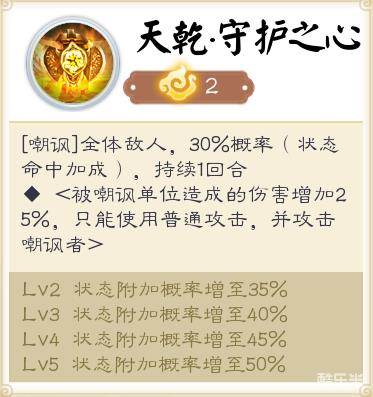 [嘲讽]全体敌人,20%概率(状态命中加成),持续1回合。(被嘲讽的单位造成的伤害增加25%,只能使用普通攻击,并攻击嘲讽者。)