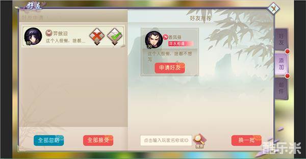 山海世界的社交系统可以分为好友系统和聊天频道系统。好友系统可以添加诸位大人在游历四方之时结交的好友,从而让彼此保持联系,如何添加好友呢?添加好友的方法很简单,可以点击好友的人物,在弹出的提示中选择申请好友,或者直接在好友一栏中输入对付的ID,就能发出好友申请啦!