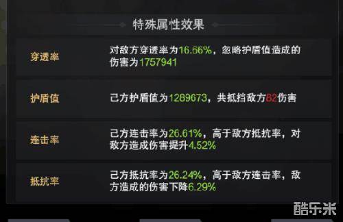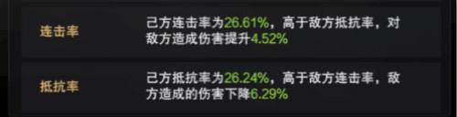 连击属性能增加伤害,上限是50%,抵抗属性能减少伤害,上限也是50%。但是在计算增伤量和减伤量是需要将连击和抵抗一起对比,若己方连击属性比敌方抵抗属性高,则能增加伤害,若己方连击属性低于敌方抵抗属性,则伤害会减少。同时,穿透属性、连击属性、抵抗属性会受到兵种克制加成的影响。当出现兵种克制时,将会出现属性减半的情况出现,这意味着现在的战场上,单兵种军团将极容易被碾压,双兵流或者三兵流将慢慢成为主流,单兵种横行天下的时代将完全过去。