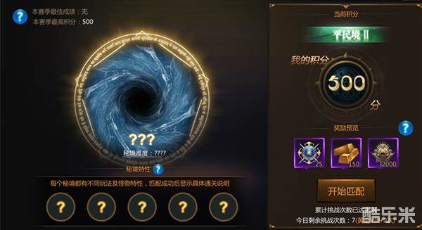 大秘境会根据玩家当前积分匹配相同级别的秘境,连胜或连败将匹配更高难度或者更低难度的秘境(简单、普通、困难、噩梦、地狱),挑战生利或失败者都将获得道具奖励,获得奖励与玩家当前段位相关,挑战成功可提高玩家秘境积分,秘境难度越高获得得积分也越多,另外在挑战前了解秘境怪物特性(泪目、缓速、恢复、狂暴、致盲)对战斗有很大的帮助。