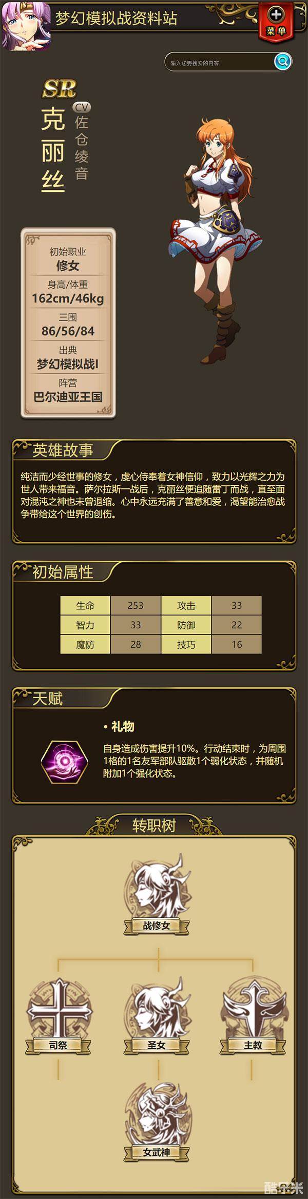 纯洁而少经世事的修女,虔心侍奉着女神信仰,致力以光辉之力为世人带来福音。萨尔拉斯一战后,克丽丝便追随雷丁而战,直至面对混沌之神也未曾退缩。心中永远充满了善意和爱,渴望能治愈战争带给这个世界的创伤。