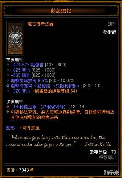 1、该法器的特效说明见图,详细效果为:当你释放冰霜射线、秘法奔流和裂光波三个技能时候,会按照1秒/次的频率释放你的技能栏里其他耗能的攻击性技能。值得注意的地方有:冰霜射线,秘法奔流和裂光波三个技能均无法彼此触发,比如当你释放冰霜射线,即便你的技能栏有秘法奔流和裂光波,也无法触发。、可以触发的技能有:秘法光球、能量震波、能量旋风、多头蛇,陨石术、暴风雪、聚能轰击和秘法黑洞。秘法光球、能量震波和聚能轰击,在使用上述三个引导技能的时候,会以你身体为中心进行释放,秘法光球行动方向与你鼠标指向方向相同;其余技能释放地点为鼠标指点方向,总的来说和你自己释放是相同的。