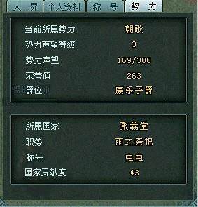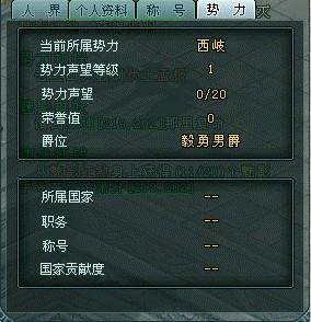 每一个势力声望等级都会有对应的爵位,玩家的势力声望等级、积分、值等将在势力声望面板中显示。显示的内容有: