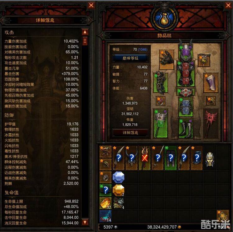 面板不算高哦,但是过71层时间还是比较充足,晚上和基友组队打了几把散组了,没事打几把,遇到蜘蛛洞就过了,没有威能,出了个电塔!【专门撕票的时候,不是狗洞,就是水道,伤不起】,宝石最高的才76级的,比起大神们90+的,弱爆了。面板有截图