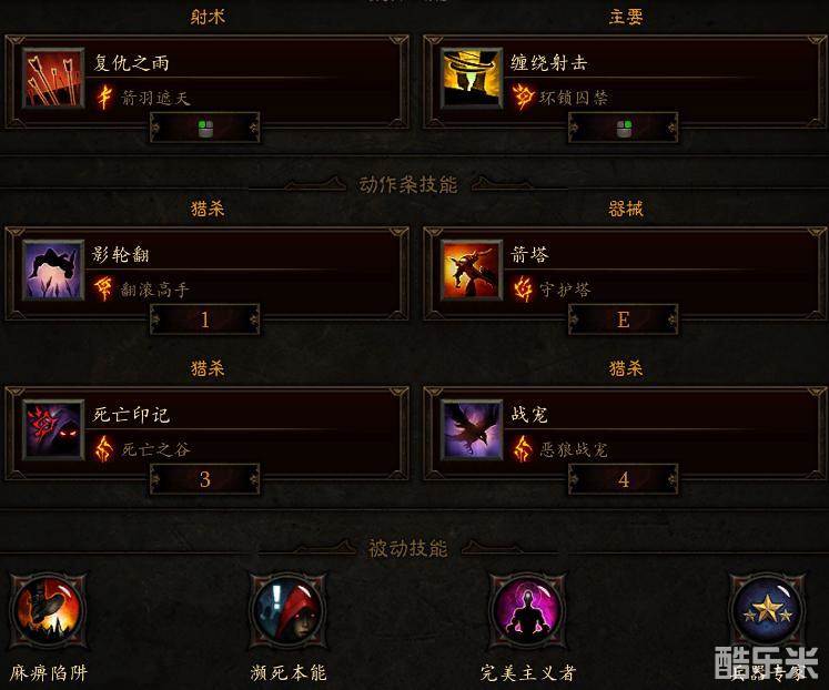 装备和技能走的论坛的工兵流和牛大的缠绕射击流的结合路线,因为本人从来不用鼠标宏,所以牛大的刀扇也没有选择,操作很累,不适合长期战斗。工兵流有改动,减伤增伤是首位,箭塔依旧是守护塔,没用折磨塔,缠绕射击缠4个,死亡谷地,狼吼必带,电箭雨,影轮翻。装备,工兵流的招牌地狱猎手,其它随意搭配。萃取为旅途终点、虚幻长靴、华戒。