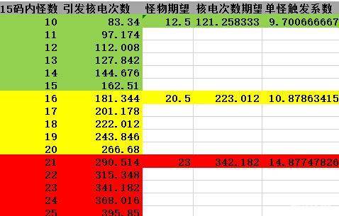 1.对于不同的怪物密度核电蛮的单怪触发系数期望分别是:9.70(稀疏),10.88(密集)和14.87(拥挤);