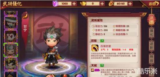 天赋上,甘宁可以给予敌人降低士气的效果,对于敌人的技能释放有一定影响。除此之外,甘宁能够减少受到灼烧、流血状态敌人所带来的伤害,为其生存带来了一定帮助。