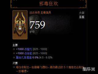 邪毒狂欢/坎邪,每当你射出一发剧毒飞镖时,离你最近的 5 个鬼娃也会射出一发毒镖。如果你想玩吹箫,那么这个面具是至关重要也是必须要有的一件。剧毒飞镖这个技能也是,因为鬼娃也是吹箫的重要来源,理论上我们要尽可能多的保持鬼娃。