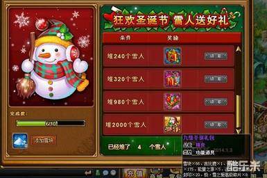 进入雪地,弹友们就可以到处游玩了,萌萌鹿、顽皮雪人、小雪妖等你去击杀。击杀一只顽皮雪人、萌萌鹿、小雪妖可分别获得4个、6个、12个雪块。收集了这些雪块干嘛呢?当然是兑换给力的礼物啦~堆雪人,拿礼!10个雪块就可堆一个雪人,告诉大家一个小秘密,添加雪块堆雪人也可以花一定数量的点券来增加双倍的效果哦。