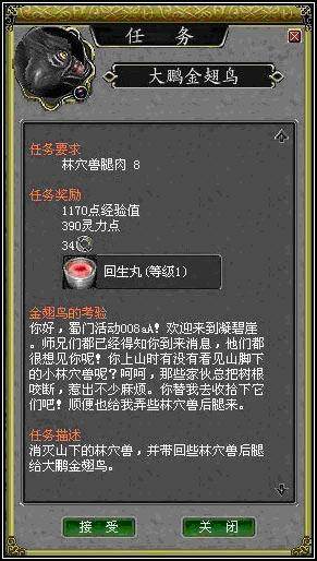 5、在“可接受任务”中选择任务,预览任务描述、任务要求、任务奖励后,点击“接受”按钮接受任务;点击“关闭”取消接受。