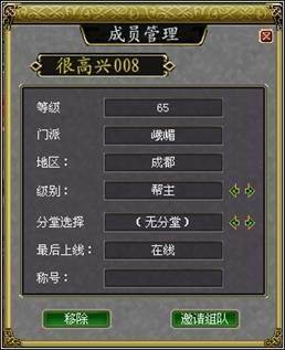 1)在帮会成员名单那里双击出现如下图的会员详细信息,点下移除键,就可以将该玩家开除出帮会