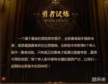 一个属于勇者的冒险即将展开,全新勇者副本强势来袭,谁是最强勇者将在这里揭晓。全新版本将新增4个单人副本--勇者试炼。只有真正的勇者才能通过重重考验,赢得丰厚的奖励,每个单人副本都有专属的道具产出,让我们一起期待全新版本的到来吧!