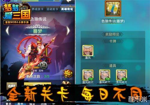 三国的英雄都有自己的国家,他们为国家出生入死,才有了纷争的三国。现在,《梦梦爱三国》开放新玩法“英雄传说”,每天开启不同的关卡,只能使用特定国家的武将挑战,每天能挑战五次,挑战中会有相应国家的大将助战,挑战成功会掉落名将碎片。此外,每个关卡都有五种难度,难度越大掉落越好。