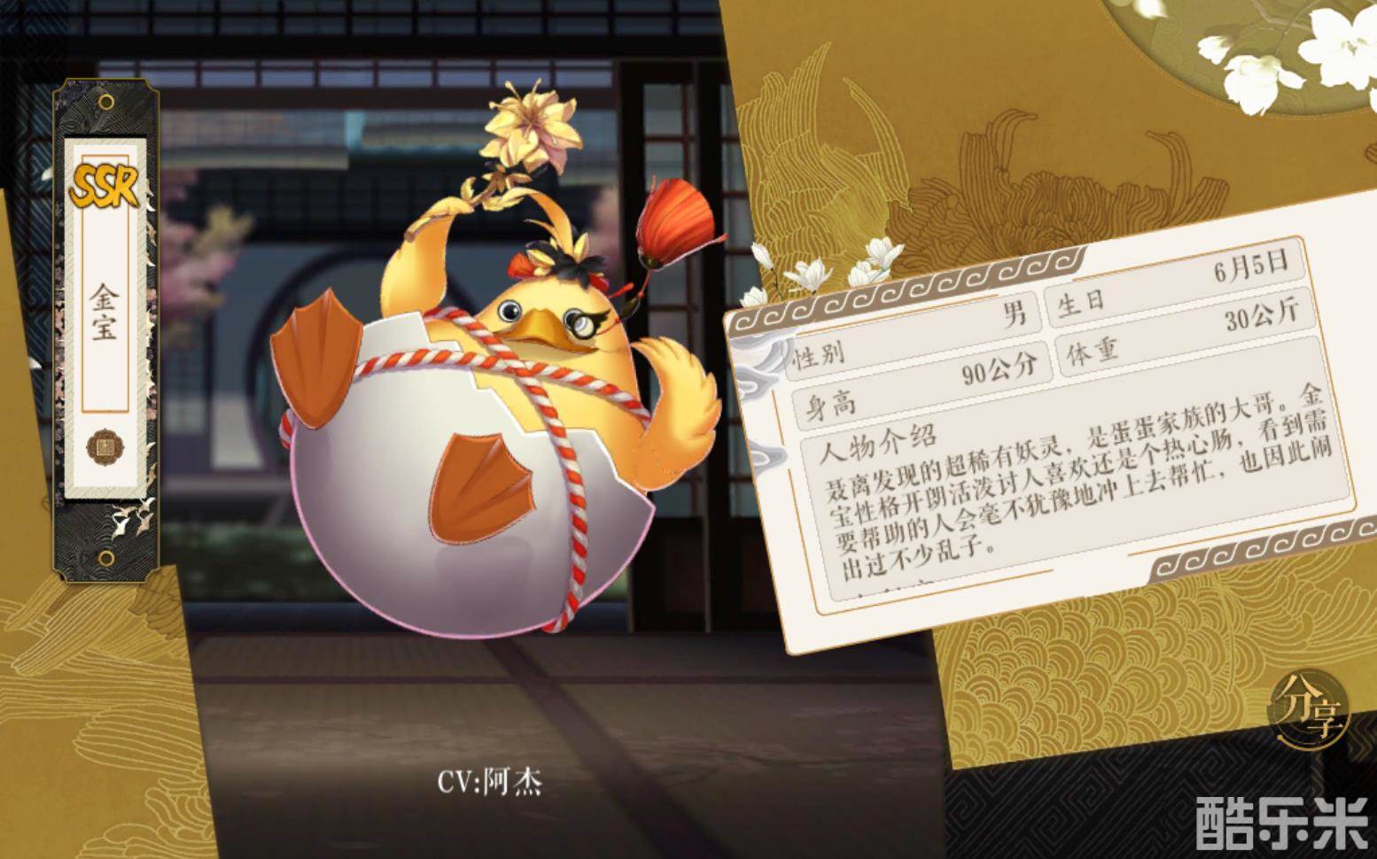 金宝,四星物品,外观为金色帅气小鸡,可以为人物卡牌提供19440加成经验。