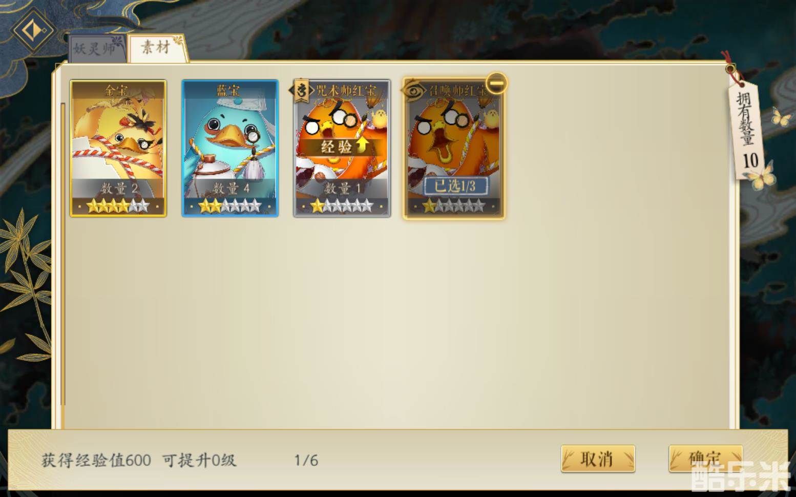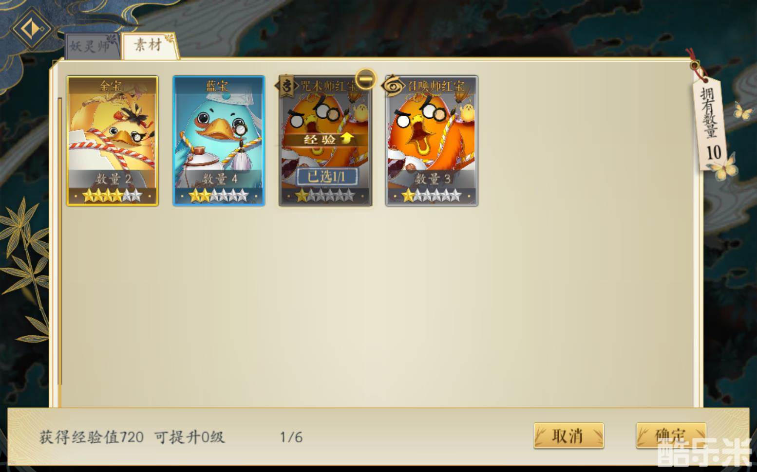在选择经验物品的界面中,“咒术师红宝”处,有经验加成的图标,选择该红包来提升经验,可以获得经验加成,一共720经验;而如果选择其他红宝,则只能获得600经验值,无法获得经验加成。